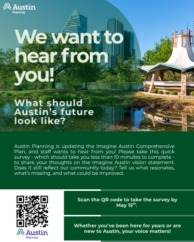 Austin Planning is updating the Imagine Austin Comprehensive Plan, and staff wants to hear from you! One of the first steps is to revisit the Imagine Austin vision statement and ask if it still describes the city we want Austin to be and reflects the values of our community.