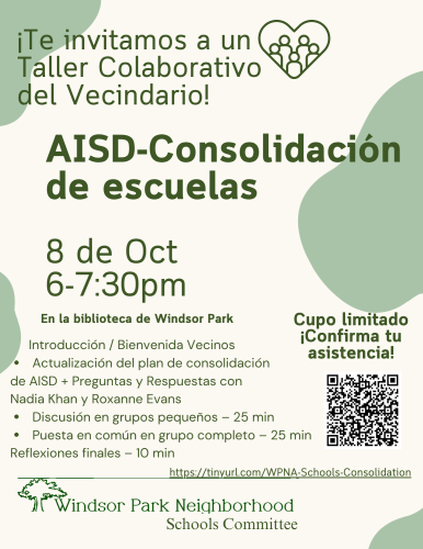AISD - Schools Consolidation Community Flyer. October 8th from 6 - 7:30 pm at Windsor Park Library